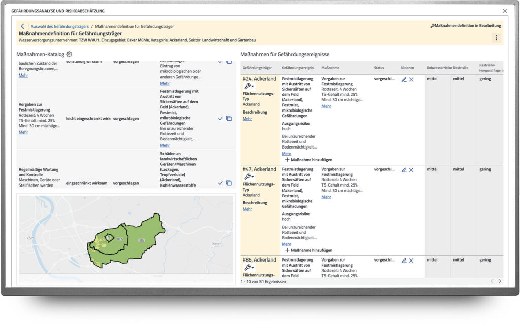RiskPlus ermöglicht Ihnen den Aufbau eines vollständigen Risikomanagementsystems aus einem Guss – vom Einzugsgebiet bis zur Abgabe an den Verbraucher. Die webbasierte Software bietet Ihnen alle notwendigen Elemente, um die Anforderungen an das Risikomanagement gemäß Trinkwasserverordnung und Trinkwassereinzugsgebieteverordnung zu erfüllen. Durch die Einbindung eines WebGIS stehen Ihnen zahlreiche hilfreiche Funktionalitäten zur Verfügung, mit denen Sie Ereignisse und Risiken kartographisch darstellen und raumbezogen auswerten können. Um Ihnen das Vorgehen noch einfacher zu machen, beinhaltet die Softwarelösung bereits grundlegende Daten für Gefährdungsträger sowie umfangreiche Vorschläge für potenzielle Gefährdungen und Maßnahmen.